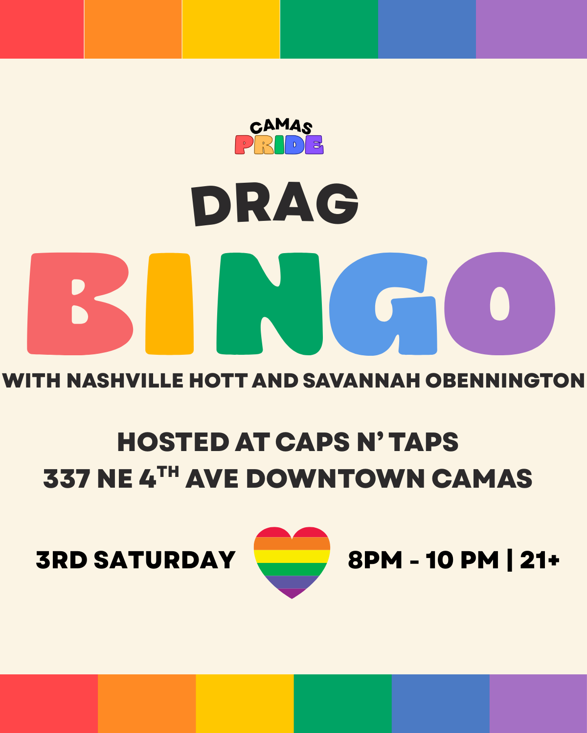 Join Nashville Hott and Savannah O. Bennington for an evening of entertainment and fun on the 3rd Saturday of each month at Caps N’ Taps in downtown Camas!